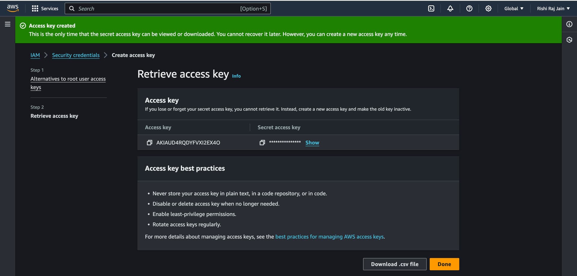 - Copy the Access key and Secret access key generated to be used as AWS_ACCESS_KEY_IDandAWS_ACCESS_KEY_SECRETrespectively.