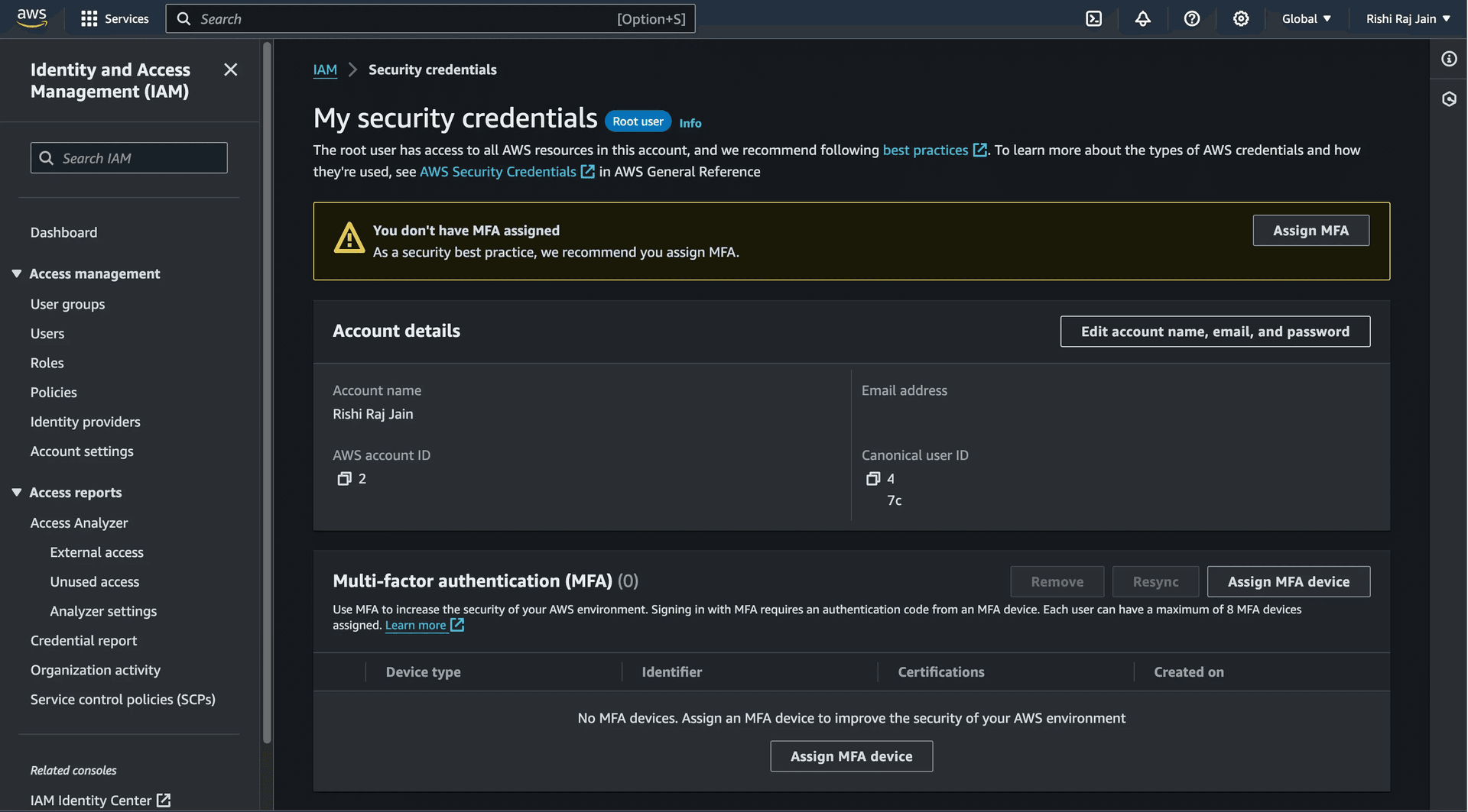 In the navigation bar on the upper right in your AWS account, click on your name, and then choose Security credentials.